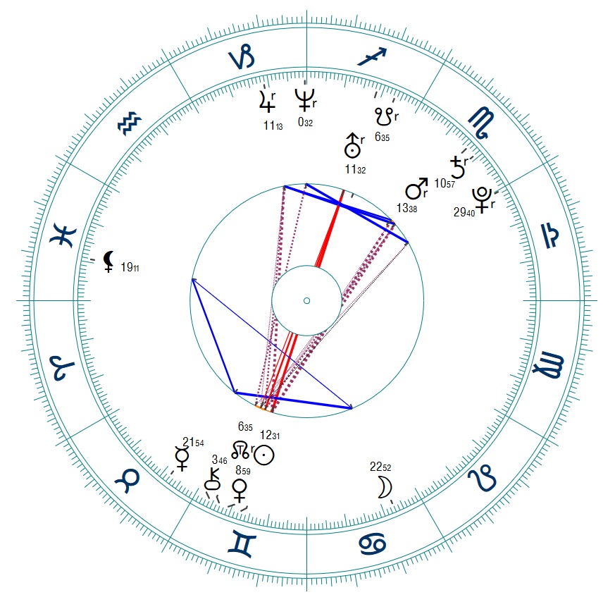 What is significant for either the 2nd or the 3rd of june, this is a huge brain. Lots of Gemini placement. Mars conjunct Saturn in Scorpio is scary. The born manipulator, probably can read people easily. Has a sense for their fears and if bad evolved, can have sadistic tendencies. Jupiter in Capricorn could be a wish for dominance. Uranus in Opposition to the Gemini stellium could imply that the whole brain activity can be channeled in the use of new technology. The aspect figure between Sun, Venus, North Node, Chiron in Gemini and Mars, Saturn in Scorpio on the one side and Jupiter in Capricorn on the other side is called a Yod or The Finger Of God. People with a Yod are said to be able to evolve special abilities. I have one as well -> The moon is still over her shoulder Well, there is a second Yod with Chiron, Pluto and Neptune. But that is a generational one, meaning many people born in that time have it. These are not as important as Yods with personal planets.